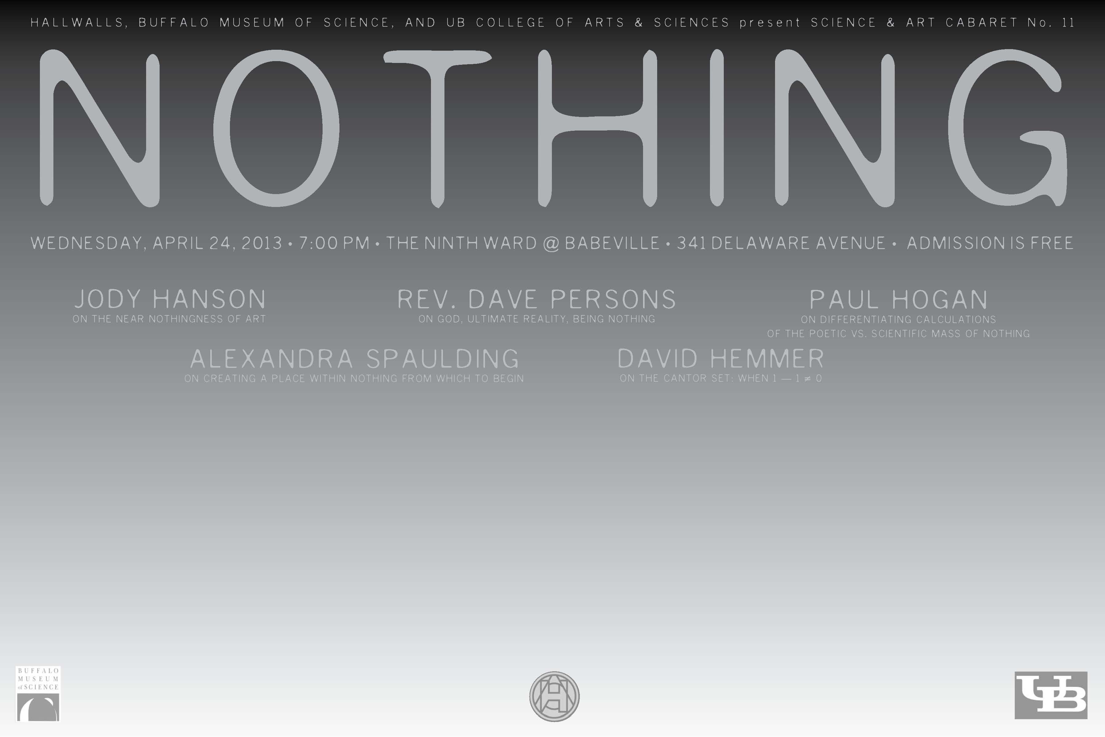 “Nothing” is the topic of the next cabaret, and the 15th cabaret held since 2009. The event will take place at 7 p.m. on Wednesday, April 24, at the Ninth Ward at Babeville, an intimate basement club at 341 Delaware Ave., Buffalo.