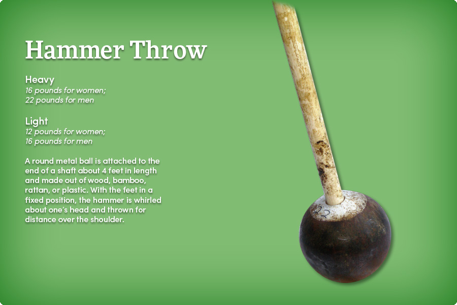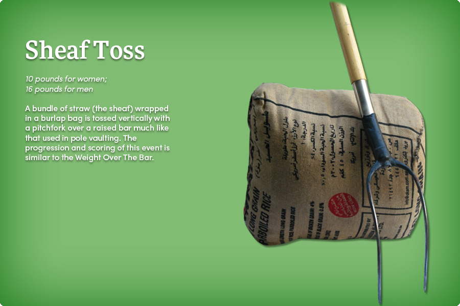 These include stones, iron weights, hammers (iron balls mounted on flexible handles, such as rattan, although now PVC pipe has become popular), sheaves (burlap-wrapped bales of grain or twine) and cabers (18- to 20-foot-long wooden poles).