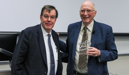 Thom Loree, MD, FACS, Plastic Surgery Program Director, presenting Dr. Jack C. Fischer with a crystal buffalo at the inaugural lectureship.